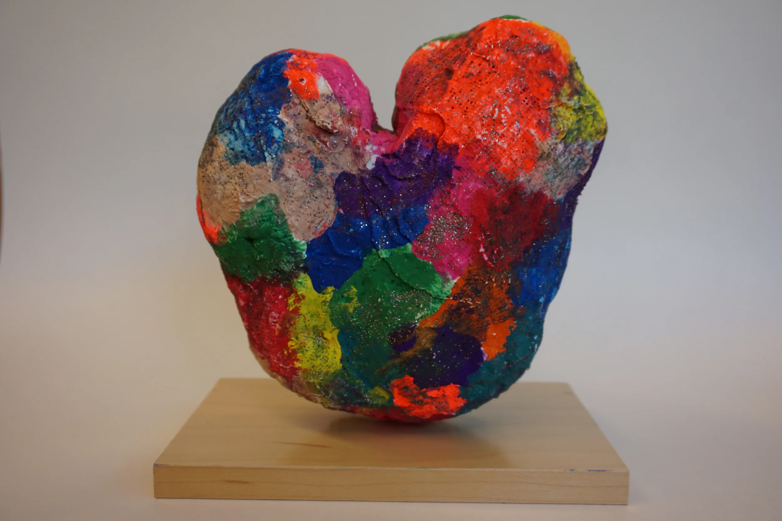 Each table had a tray with about a dozen colors. From this palette students could choose how to paint their heart. Would it look more like "Confetti Heart"? Would they blend their colors or would they not attempt to mix colors? Would they go more warm than cool or vice versa? Their options were only limited by their own minds. Once they had completed the front, back, and sides they could take their heart to the back table and add glitter paint because who doesn't love glitter paint!?
