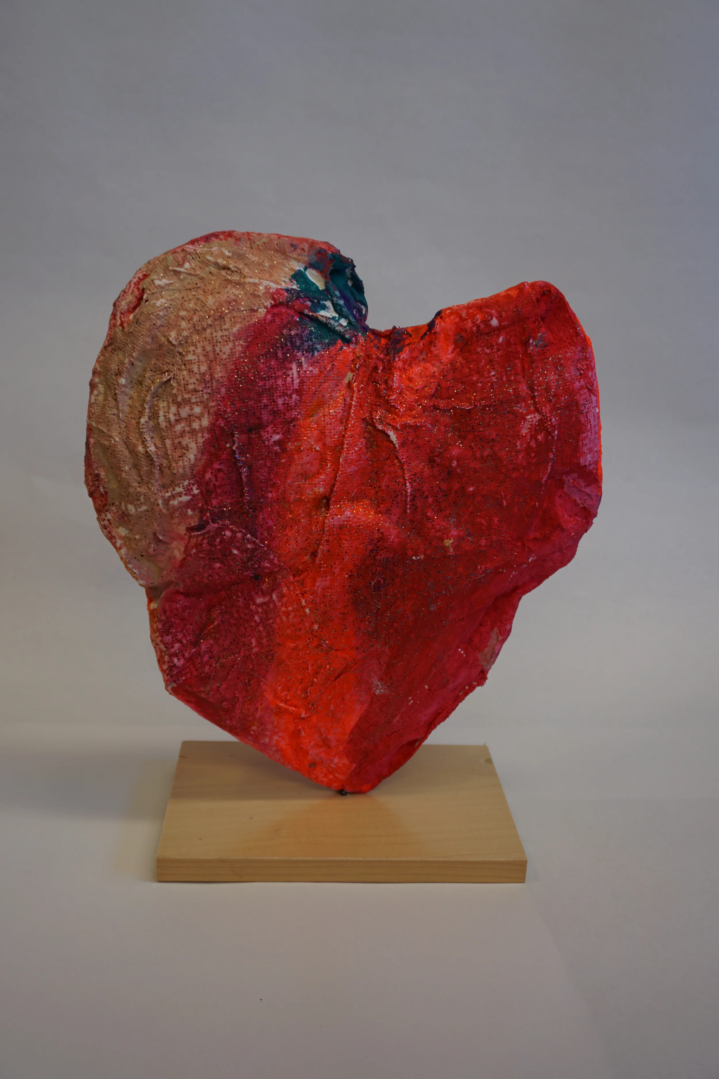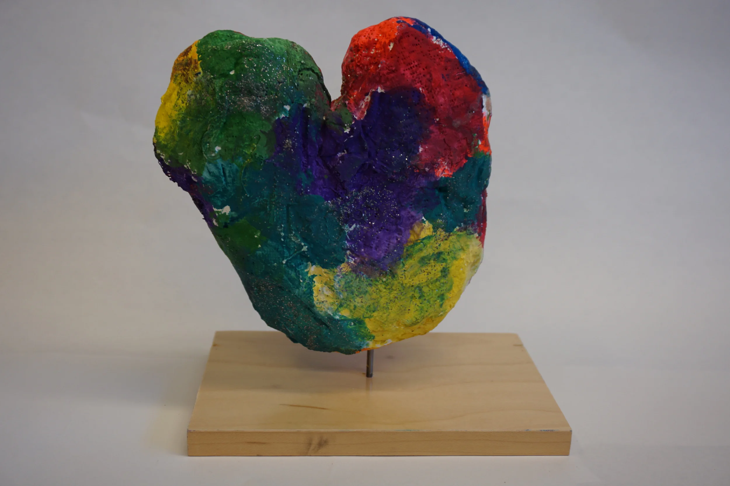 I used stilts that are normally used in the kiln to elevate the hearts so they could dry. When they were ready I drilled a hole in the bottom of the heart and hammered a nail into a small base. Using a drop of super glue to ensure a secure hold, I slid the heart onto the nail to create a standing sculpture. How fun are they?!