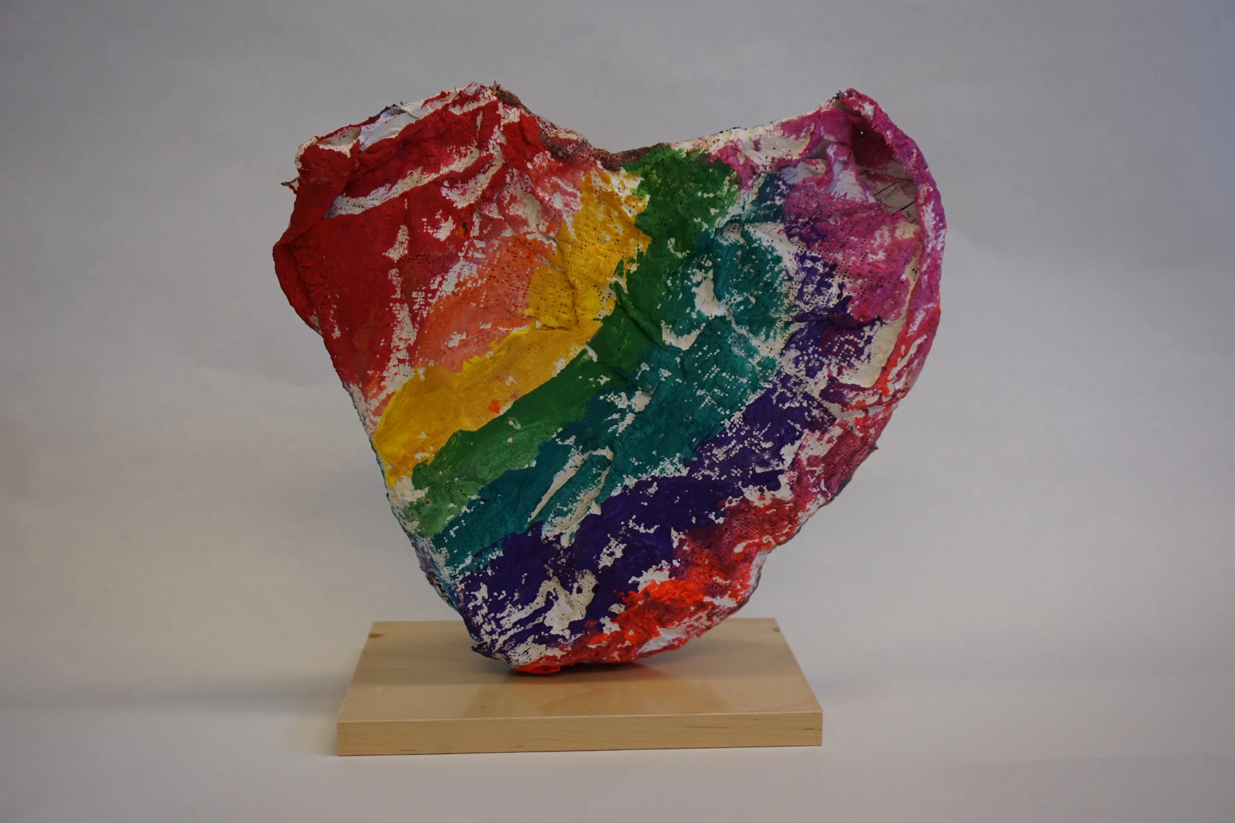 At three tables I set out paper and two shallow buckets of water. Dispersed around the table were stacks of cut up plaster cloth. Students worked until they covered the front, back, and sides. Before washing their hands I had them dry some of the plaster mess off their hands with a paper towel to reduce the mess in the sinks. I set up a space of my sink counter with paper so the hearts had a place to dry. The paper was convenient because I could write their names on it and not mess with the wet plaster or name tags. Win. It took about three days of rotating for the heart forms to dry. Luckily I see this class once a week and they were bone dry by the time they came back.
